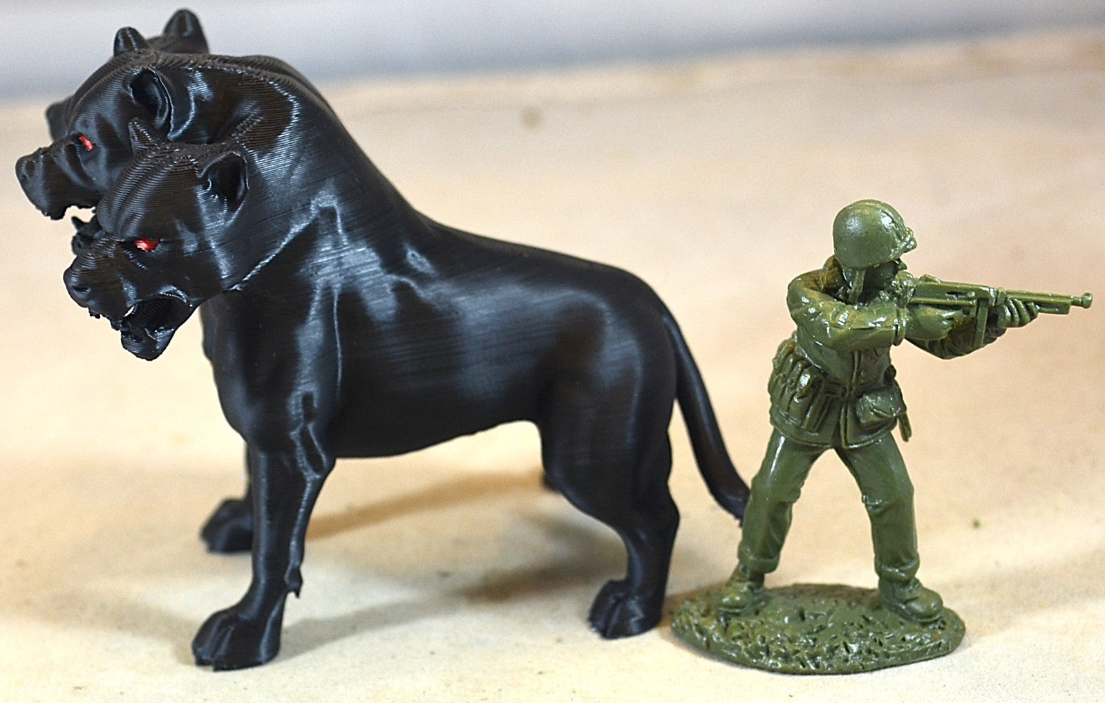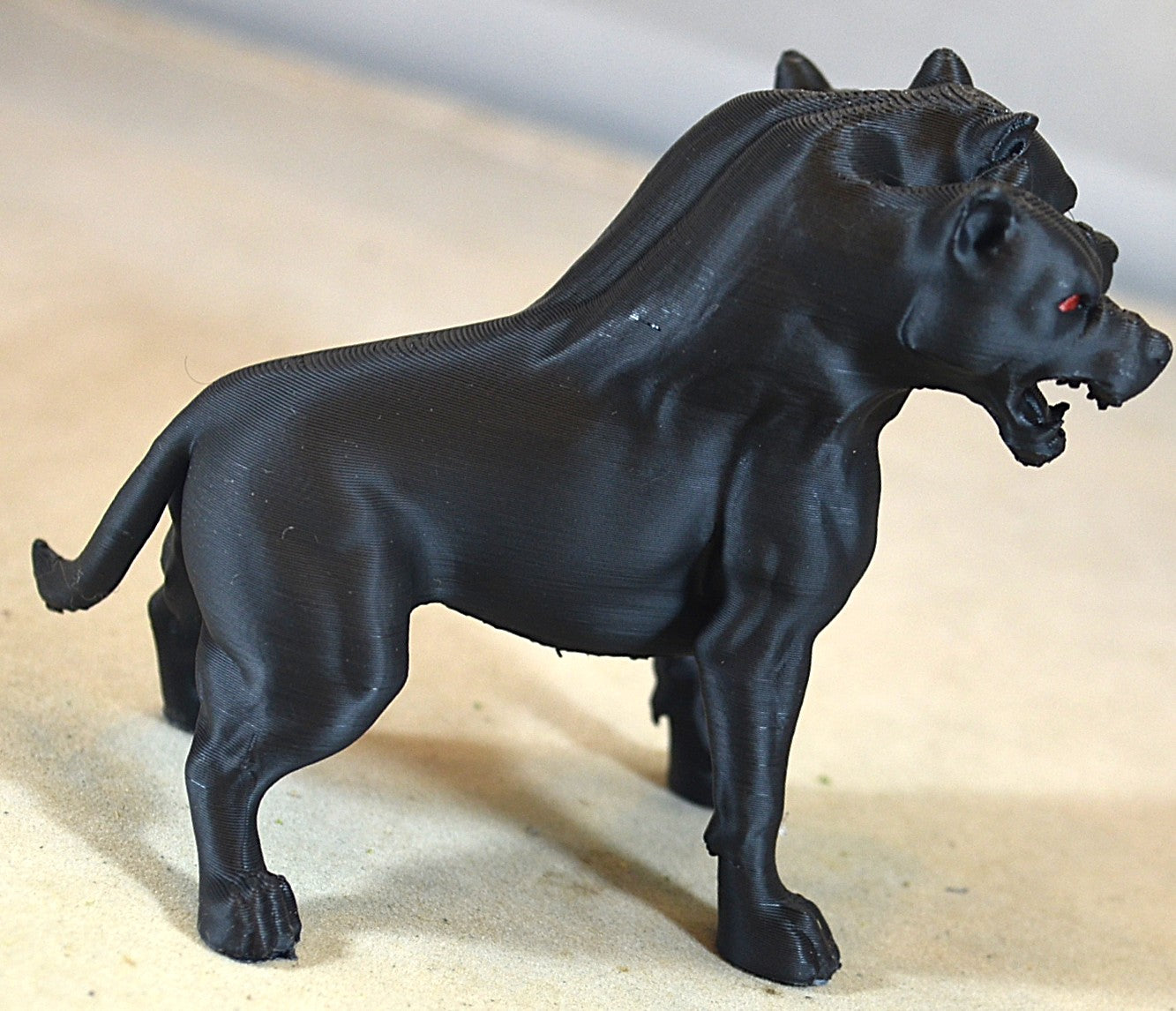 - Size and Color: Silver-studded red collars contrast with the black fur of Cerberus, creating a sleek look to this guard dog of Hades. The figure is 4 ¾ inches long, about the same as a DVD.